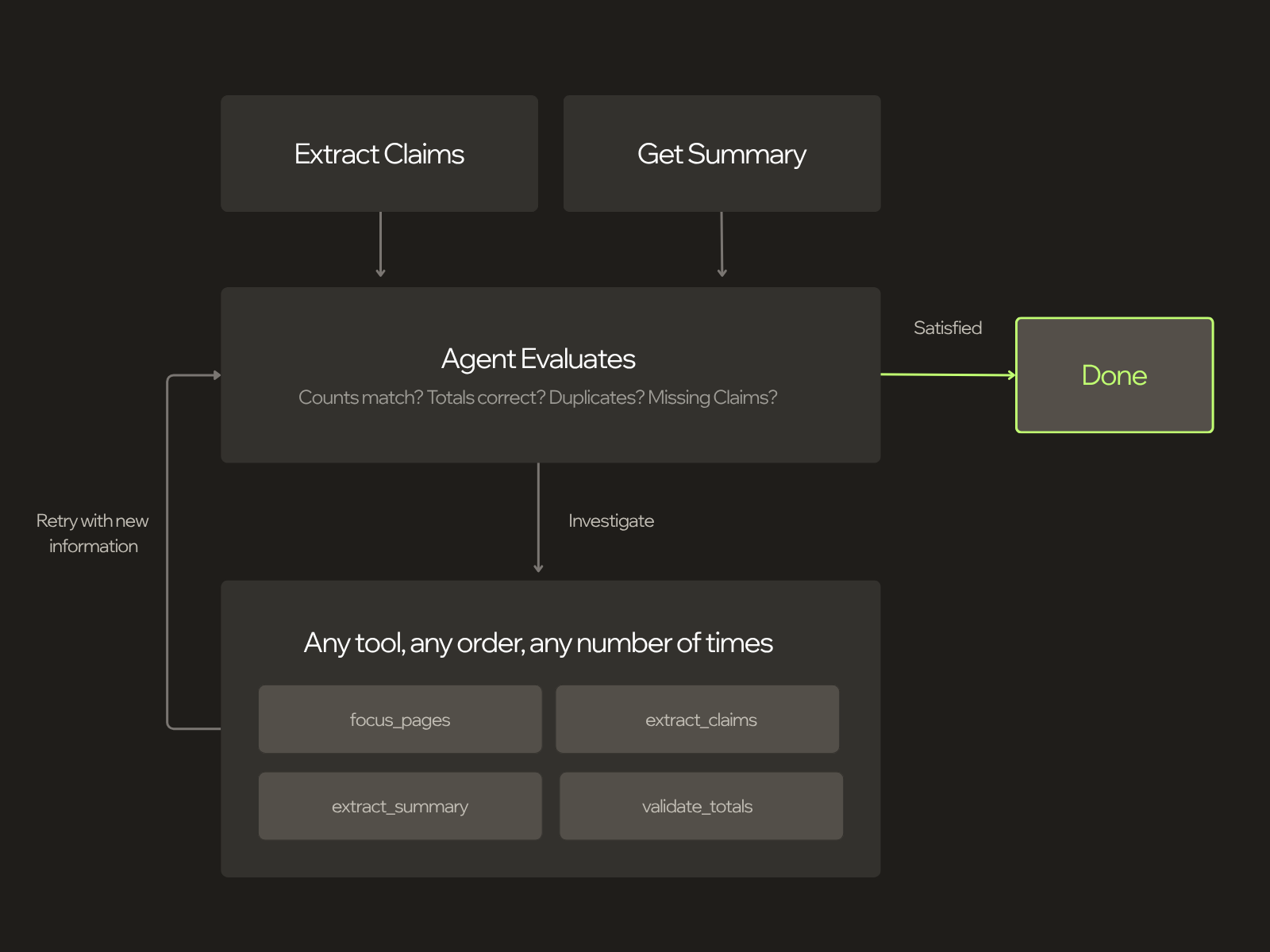 Checks financial totals AND claim count."""We were surprised by how little the extraction backend mattered once the agent was in the loop. In practice, we use different extraction backends — sometimes a commercial extraction service, sometimes LLMs directly — and the pattern is the same across both. The backend affects the quality of the first pass, but it is not the fundamental driver of system performance in this setup. Even a weaker model produces usable output when something intelligent is reviewing it, catching the mistakes, and iterating. The agent doesn't need a perfect first pass — it needs a good enough starting point and the tools to check its own work.